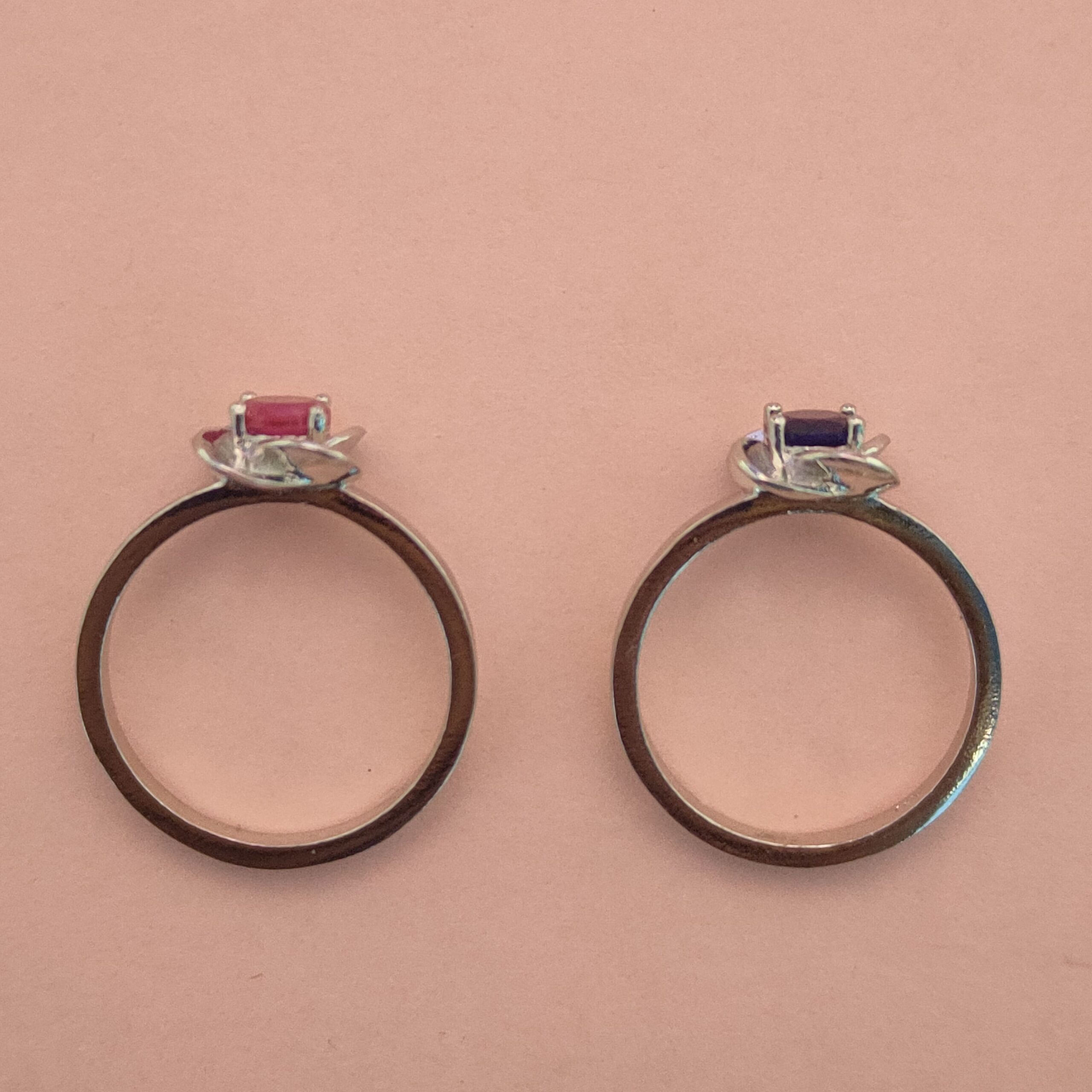 This elegant silver ring features a timeless floral-inspired solitaire design set with a beautifully faceted gemstone. Crafted from premium 92.5 sterling silver, the slim polished band enhances the brilliance of the center stone while ensuring a comfortable fit for everyday wear. The secure floral prong setting adds a soft, feminine charm, making this ring ideal for daily styling, gifting, or special occasions. Available in classic ruby and sapphire gemstone variations, this piece blends simplicity with refined elegance.