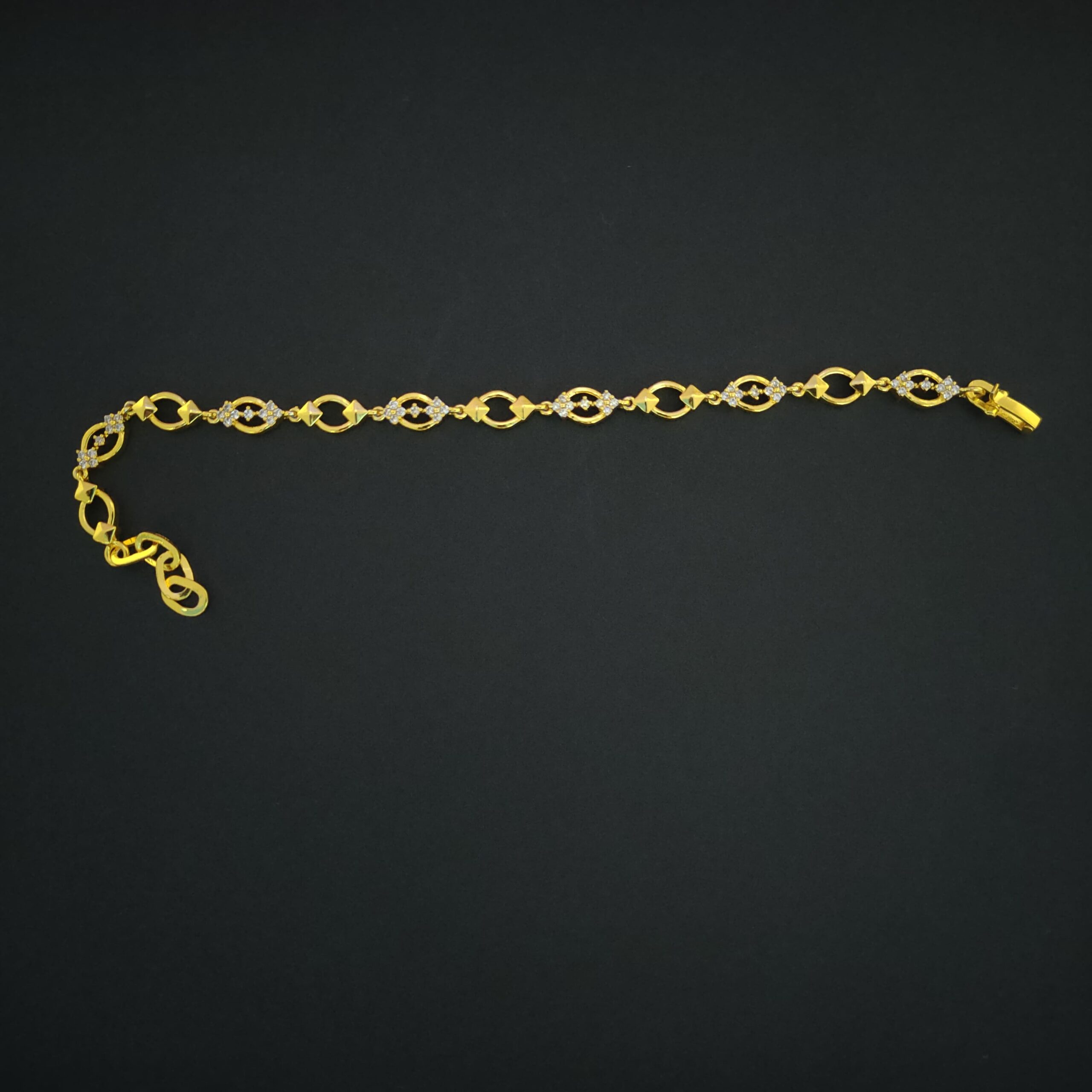 This elegant patterned link bracelet is crafted from high-quality 925 sterling silver and finished with a radiant gold-tone polish. The design features delicately shaped open links, highlighted with subtle cubic zirconia accents that add a refined sparkle without overpowering the overall look. Each link is carefully connected to create a smooth, balanced flow around the wrist, offering both comfort and visual appeal.