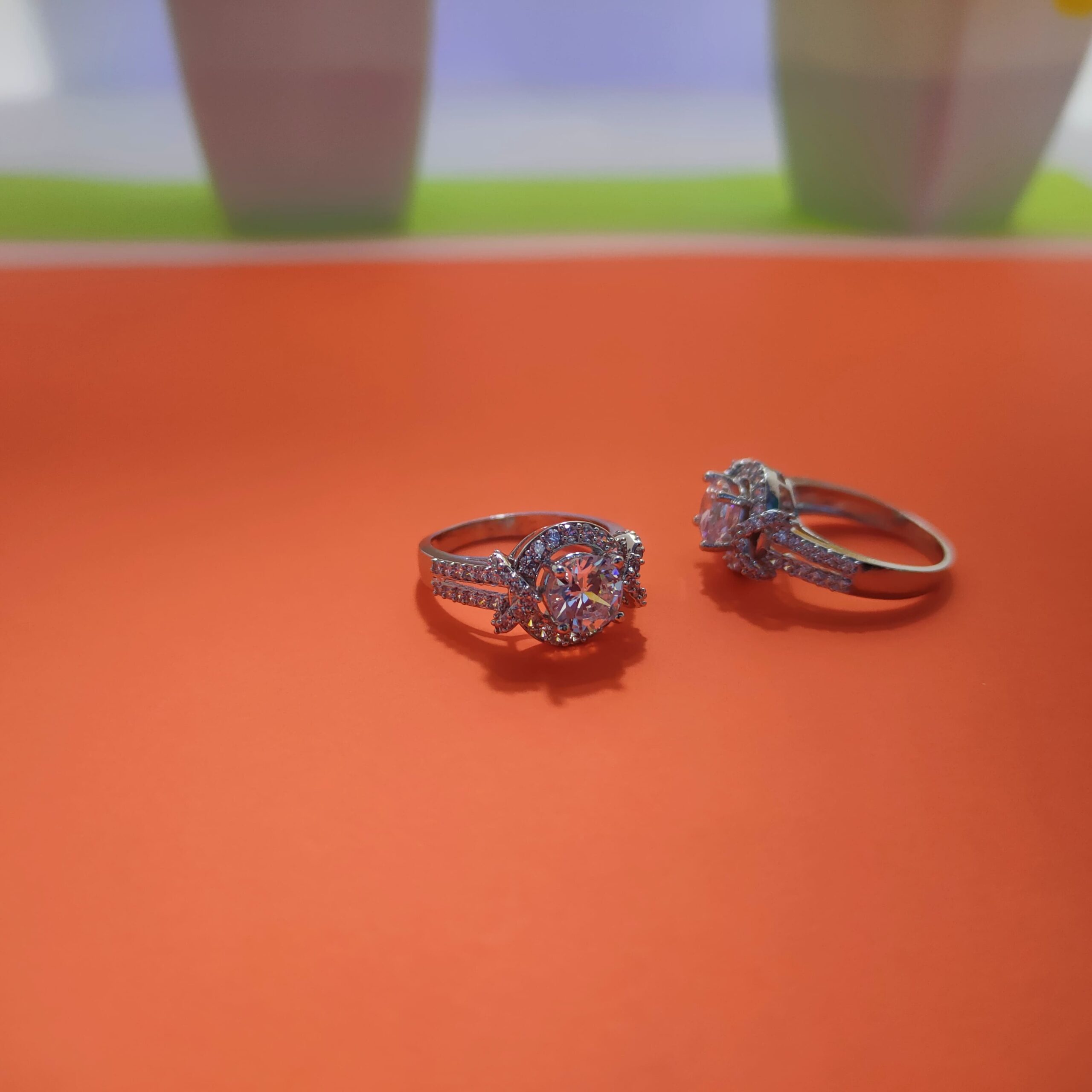 This elegant silver ring features a beautifully crafted halo design surrounding a brilliant round-cut center stone. Made from premium 92.5 sterling silver, the ring is accented with finely set pavé stones that enhance its sparkle while maintaining a smooth and comfortable fit. The solid band construction ensures durability, making it suitable for both daily wear and special occasions. A timeless design that effortlessly blends sophistication with modern elegance.