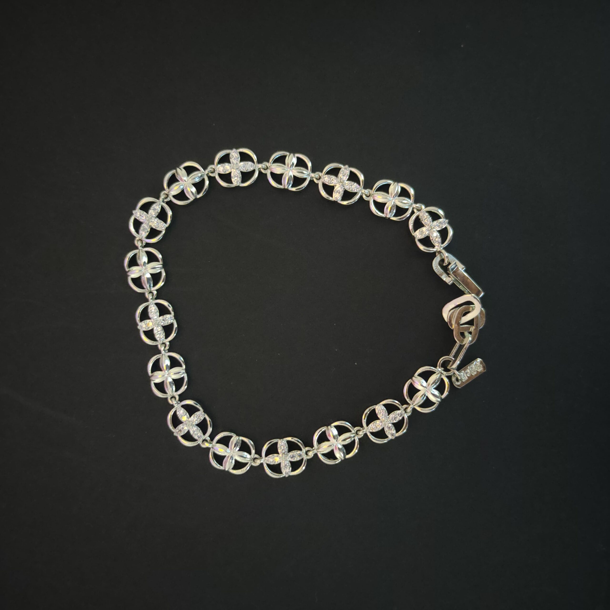 This modern circular link bracelet is crafted from high-quality 925 sterling silver and designed to showcase clean geometry with refined elegance. Featuring a series of evenly spaced circular links accented with a subtle cross-style structure, this bracelet creates a balanced and visually appealing pattern. The smooth, polished finish enhances its shine while maintaining a soft, sophisticated look suitable for everyday wear.