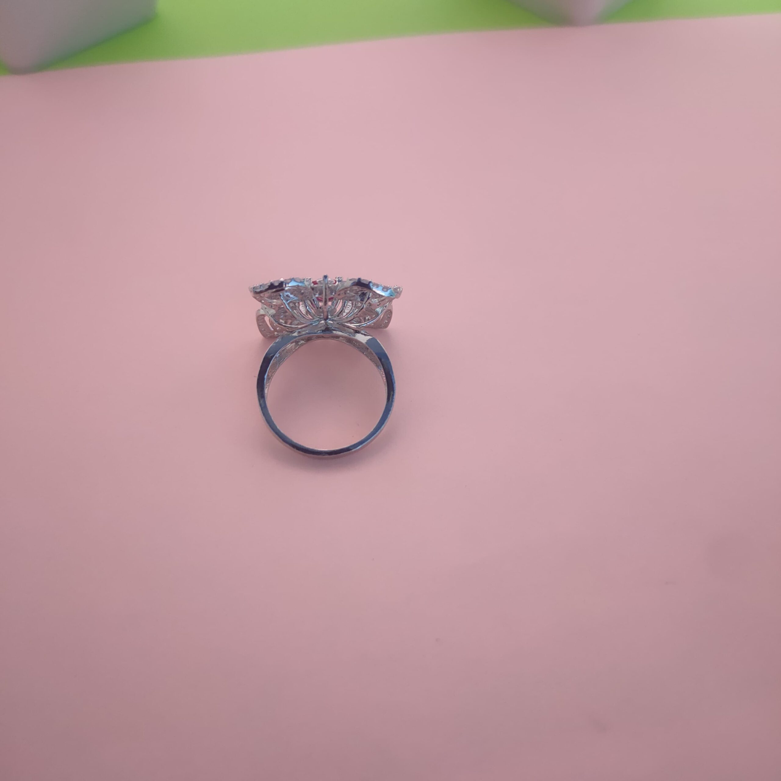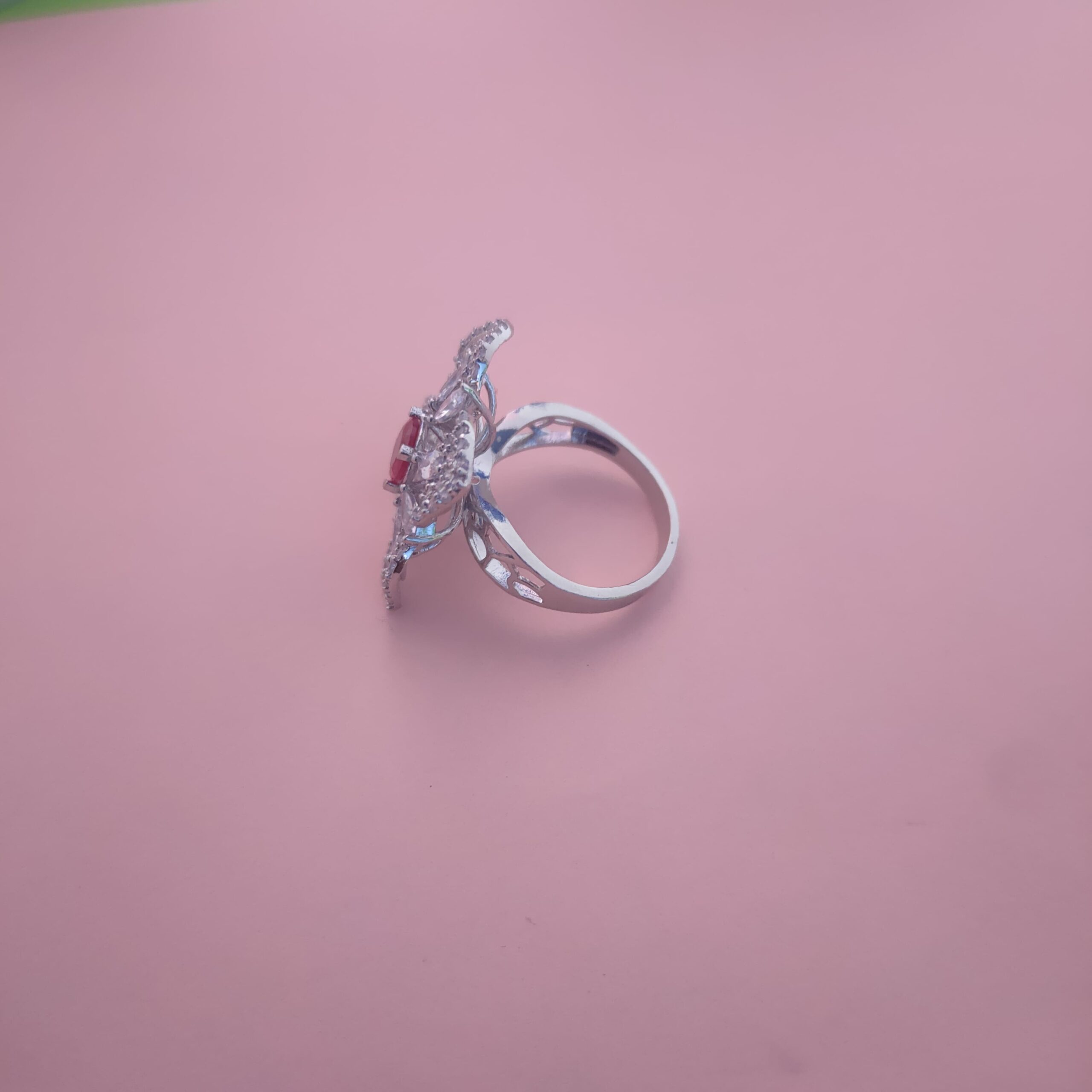 This elegant statement ring features a captivating floral design highlighted by a rich red center stone, surrounded by sparkling cubic zirconia accents. Crafted from premium 92.5 sterling silver, the intricate petal-inspired pattern adds depth and brilliance to the design. The polished finish and solid band structure ensure comfortable wear, making it ideal for festive occasions, parties, and special gifting. A perfect blend of traditional charm and modern elegance, this ring is designed to stand out.